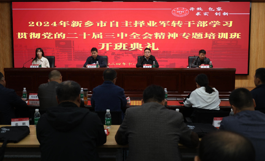 为深入学习贯彻习近平新时代中国特色社会主义思想和党的二十届三中全会精神,强化退役军人思想政治引领,11月4日上午,2024年新乡市自主择业军转干部学习贯彻党的二十届三中全会精神专题培训班在我校开班。新乡市退役军人事务局副局长赵虎山、自主择业军队转业干部服务中心主任郭强、新乡学院继续教育学院院长田大治、副院长田贝贝出席开班典礼,33名自主择业军转干部参加培训。