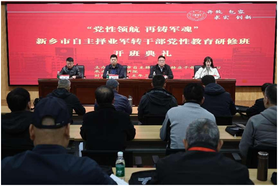为深入学习贯彻党的二十届三中全会精神,强化自主择业军队转业干部的党性修养与使命担当,3月18日上午,“党性领航 再铸军魂”新乡市自主择业军转干部党性教育研修班在我校隆重开班。新乡市退役军人事务局副局长赵虎山、自主择业军队转业干部服务中心主任郭强、新乡学院继续教育学院院长田大治、副院长田贝贝出席开班典礼。